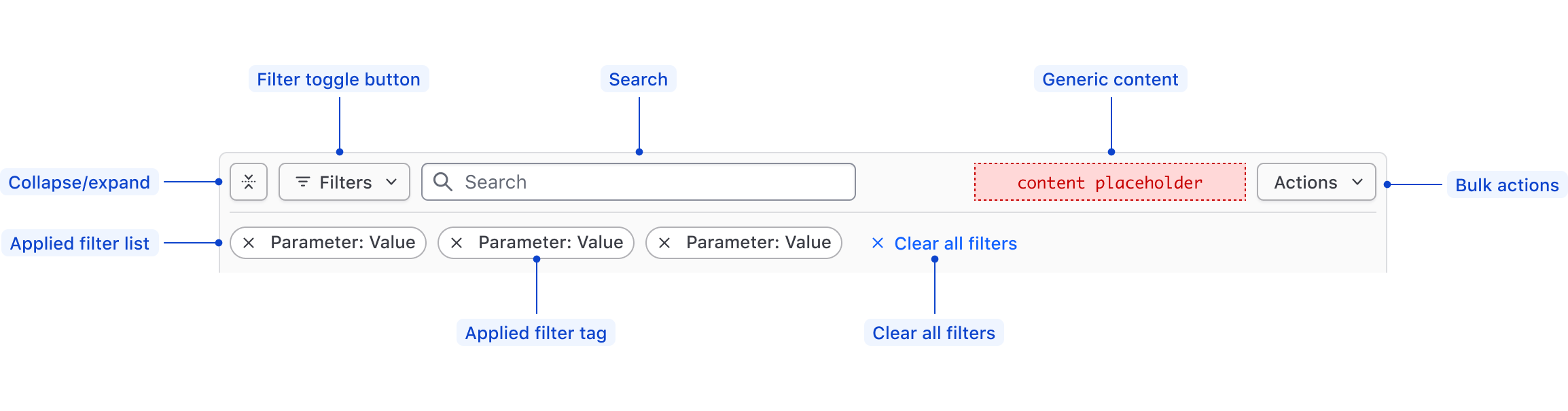 Applied Filters List Required; Displays the filters that have been applied to the data set, or an empty state.