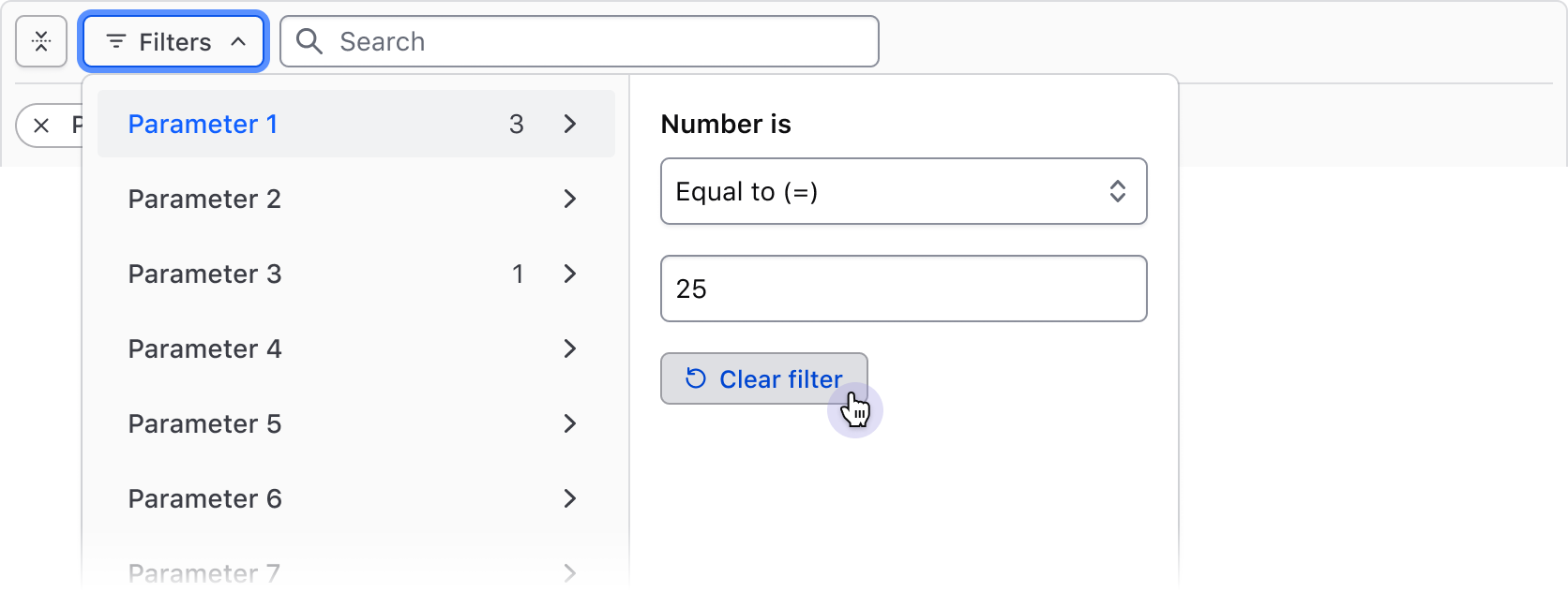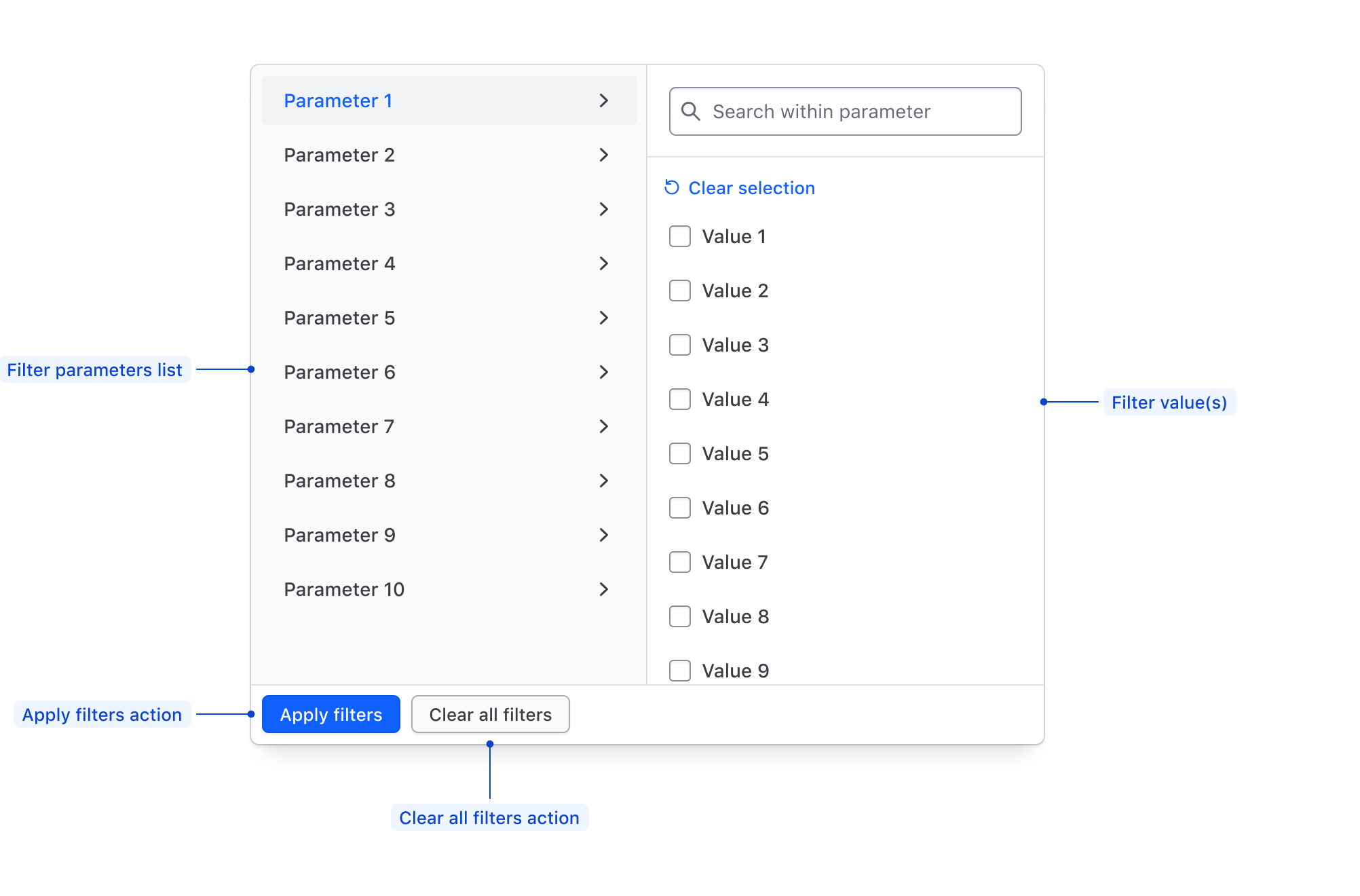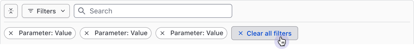 Clear all filters action Required; Clears the selection of filters across all parameters.