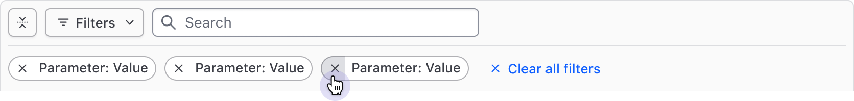 The Filter Bar supports expanding and collapsing the applied filters section to help simplify the UI around the data set and bring focus to the data or content. This is especially helpful when many filters are applied or the data set is very complex.