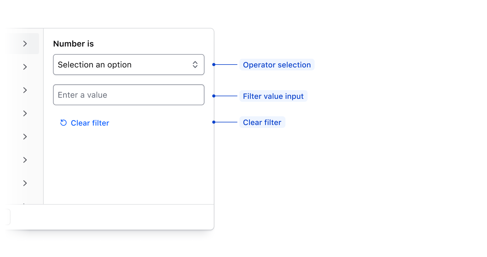 Clear filter Required; Clears the filter operator and input fields.
