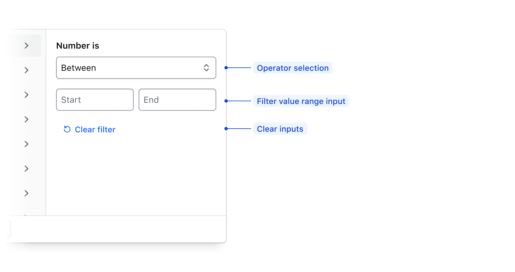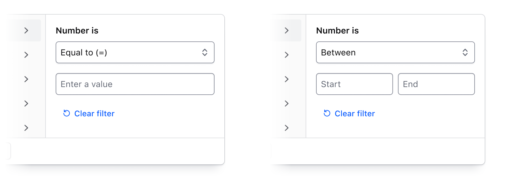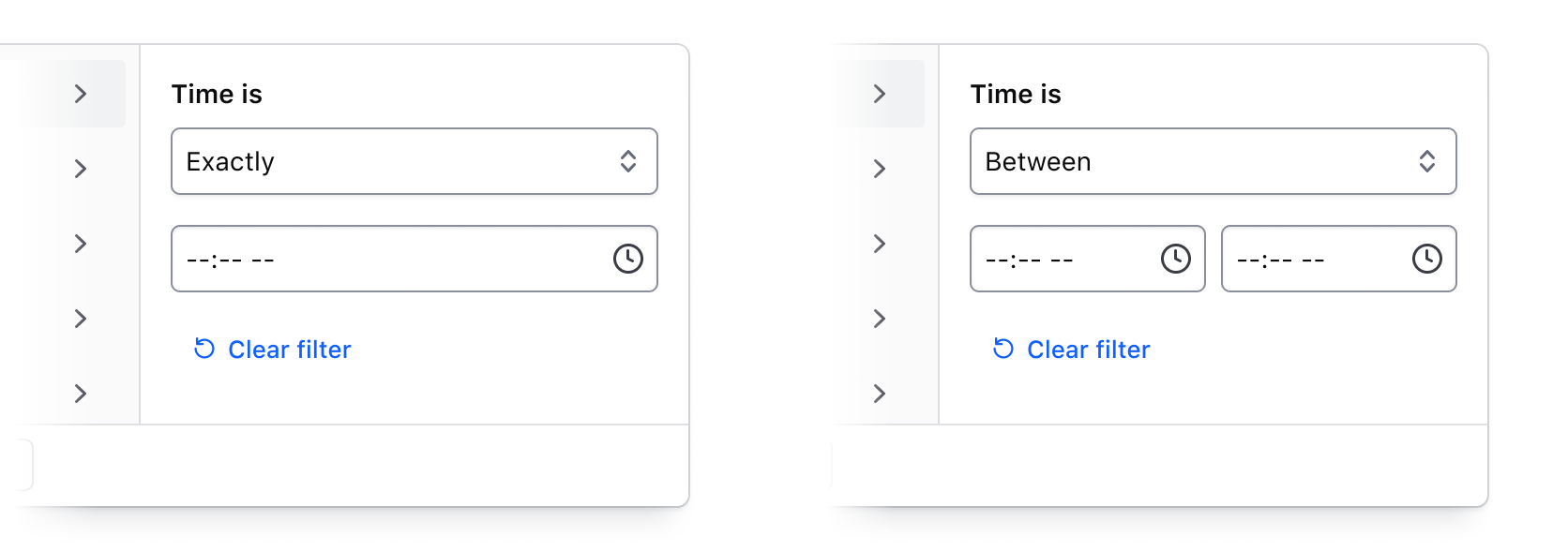 • The right panel conditionally displays either a list of options, or a grouping of input fields when filtering by a numerical, date, or time value.