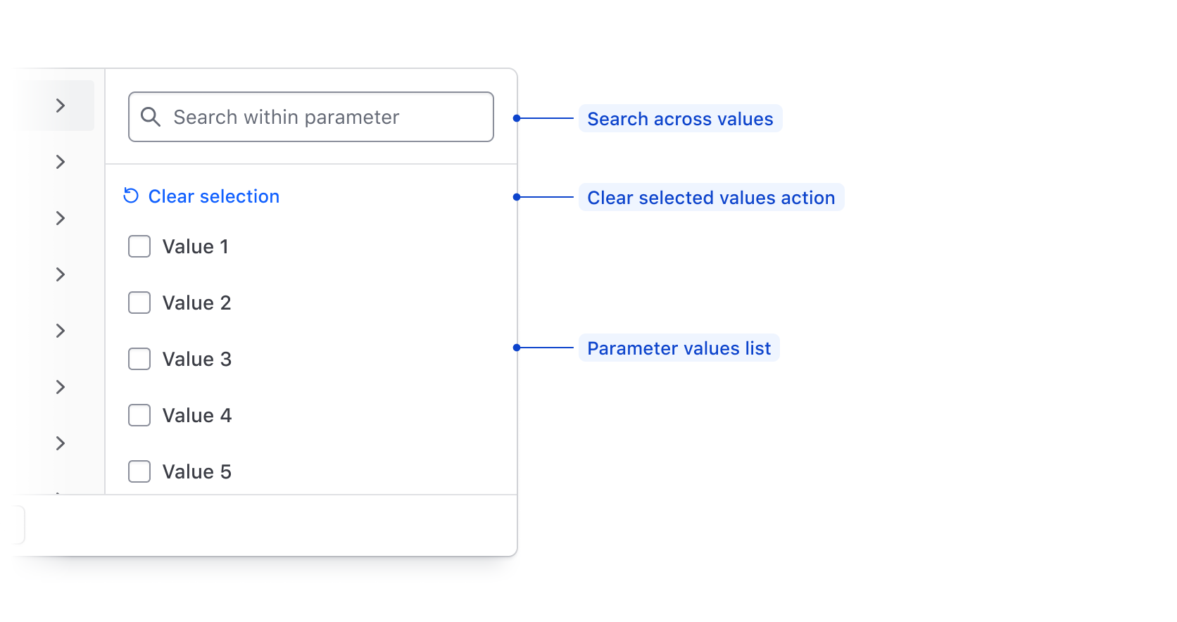 Filter value(s) Required; Displays available values within a parameter for selection, or allows the input of custom values.