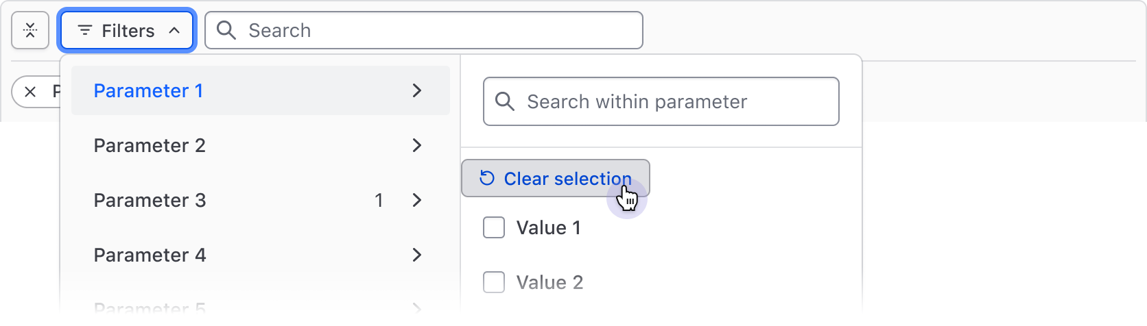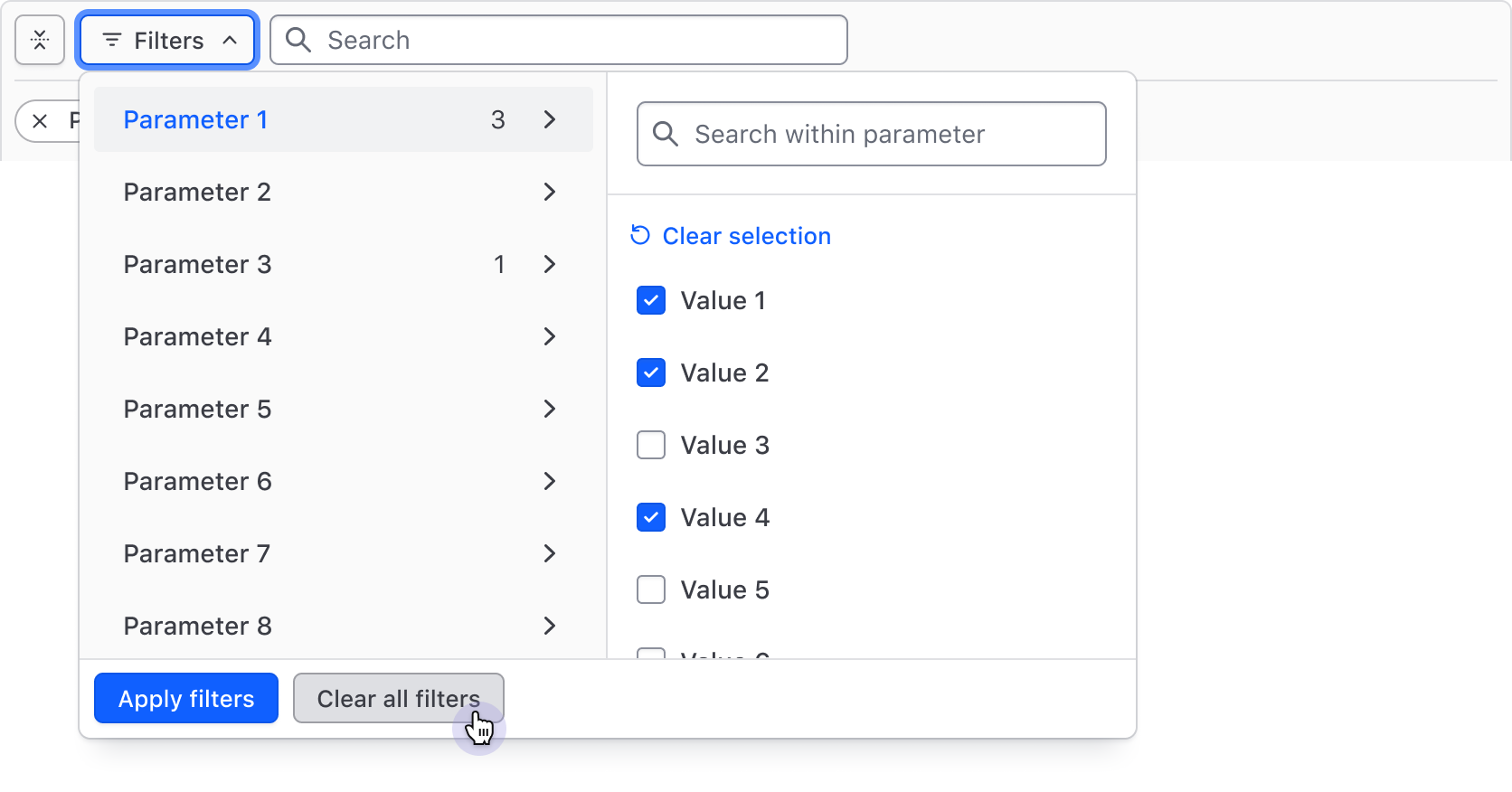 De-select all filter values within a parameter with the "Clear selection" Button, then confirm the changes with the "Apply filters" Button in the footer.