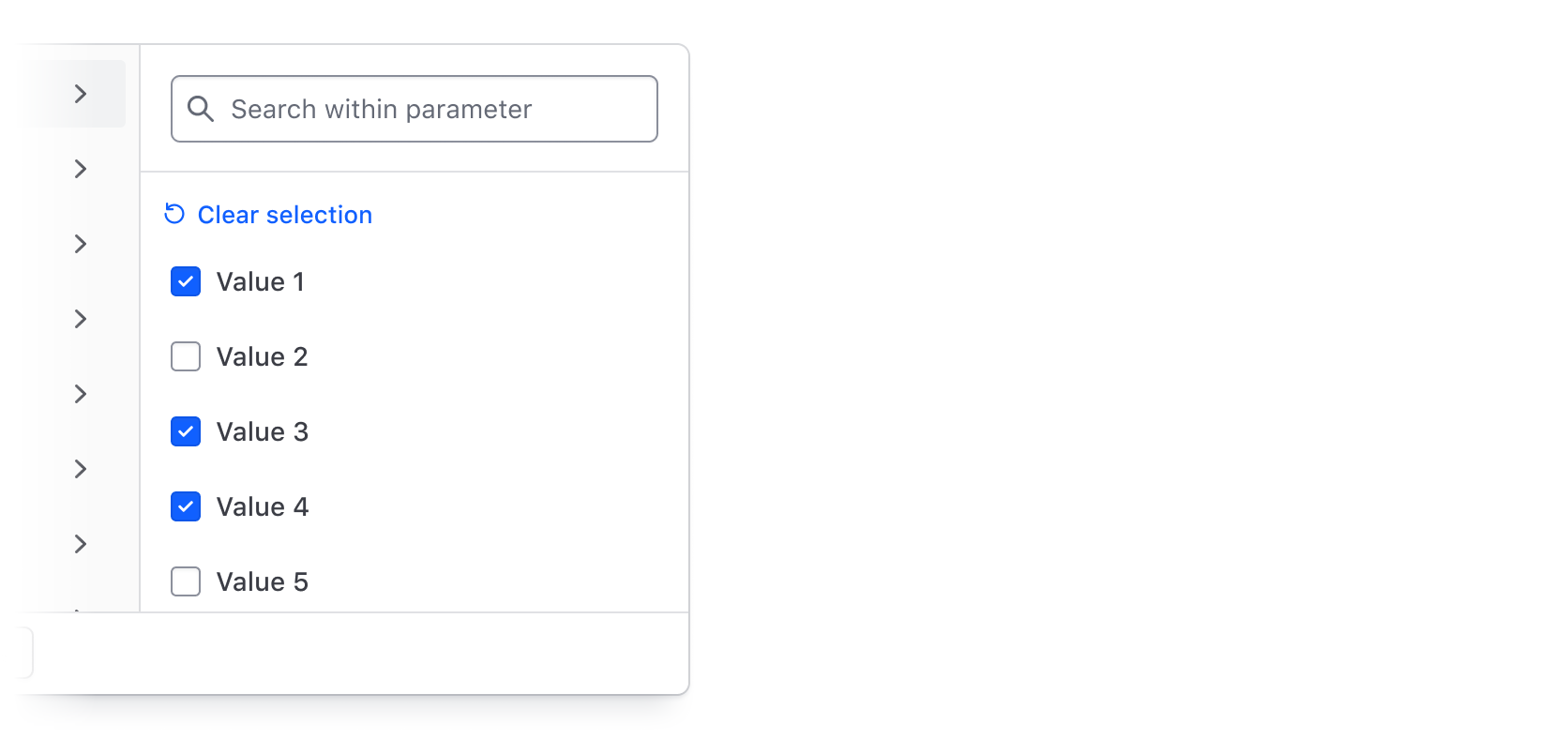Use the integrated search (hasSearch) in the values panel to allow users to search by string across all values within a selected parameter. This can be useful if there are many filter values or if a unique naming convention is used to artificially group results together.