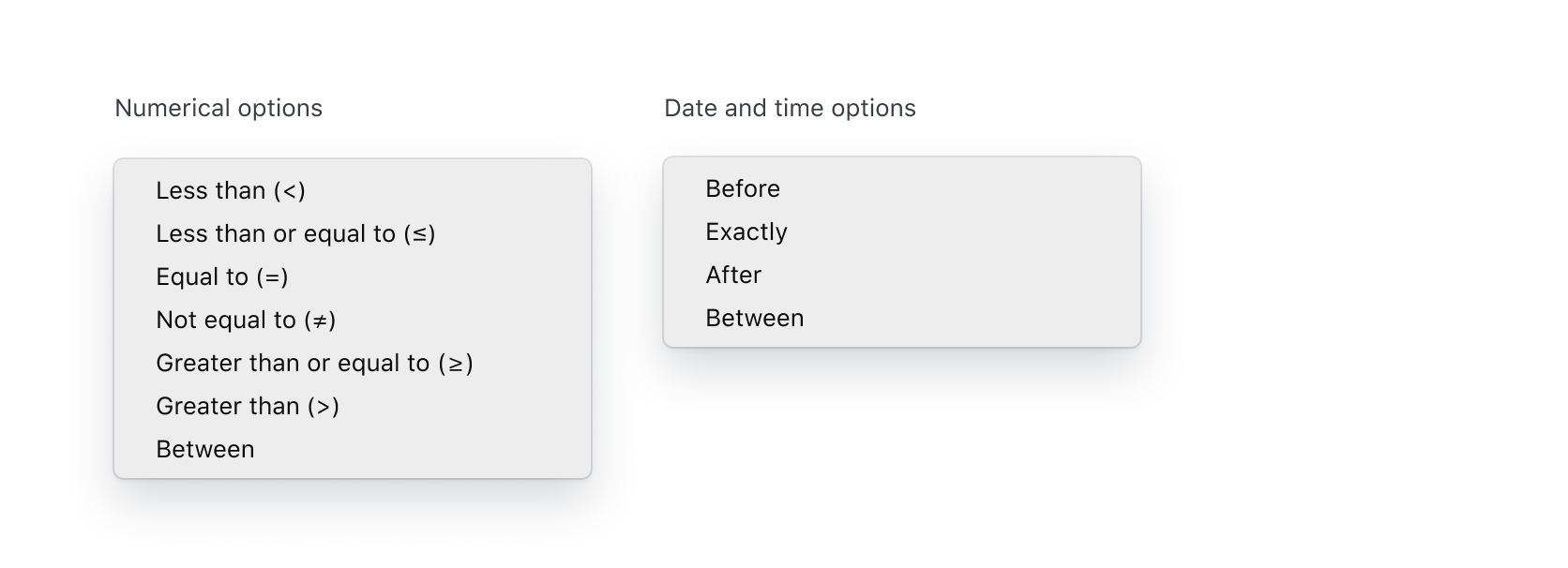 Numerical Less than (>), Less than or equal to (≤), Equal to (=), Not equal to (≠), Greater than or equal to (≥), Greater than (>), Between