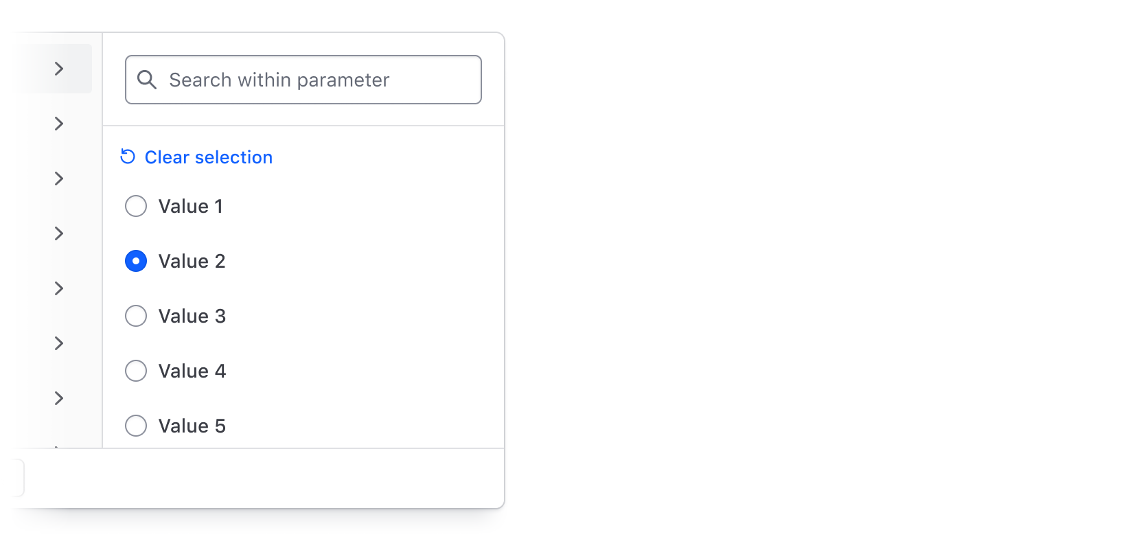 This filter value selection anatomy is the same for single selection using radios.