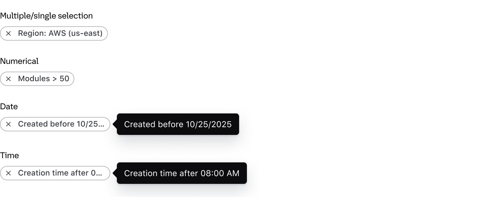 • Date and time filters group the parameter and value with natural language; e.g., "Creation time before 12:00 PM".